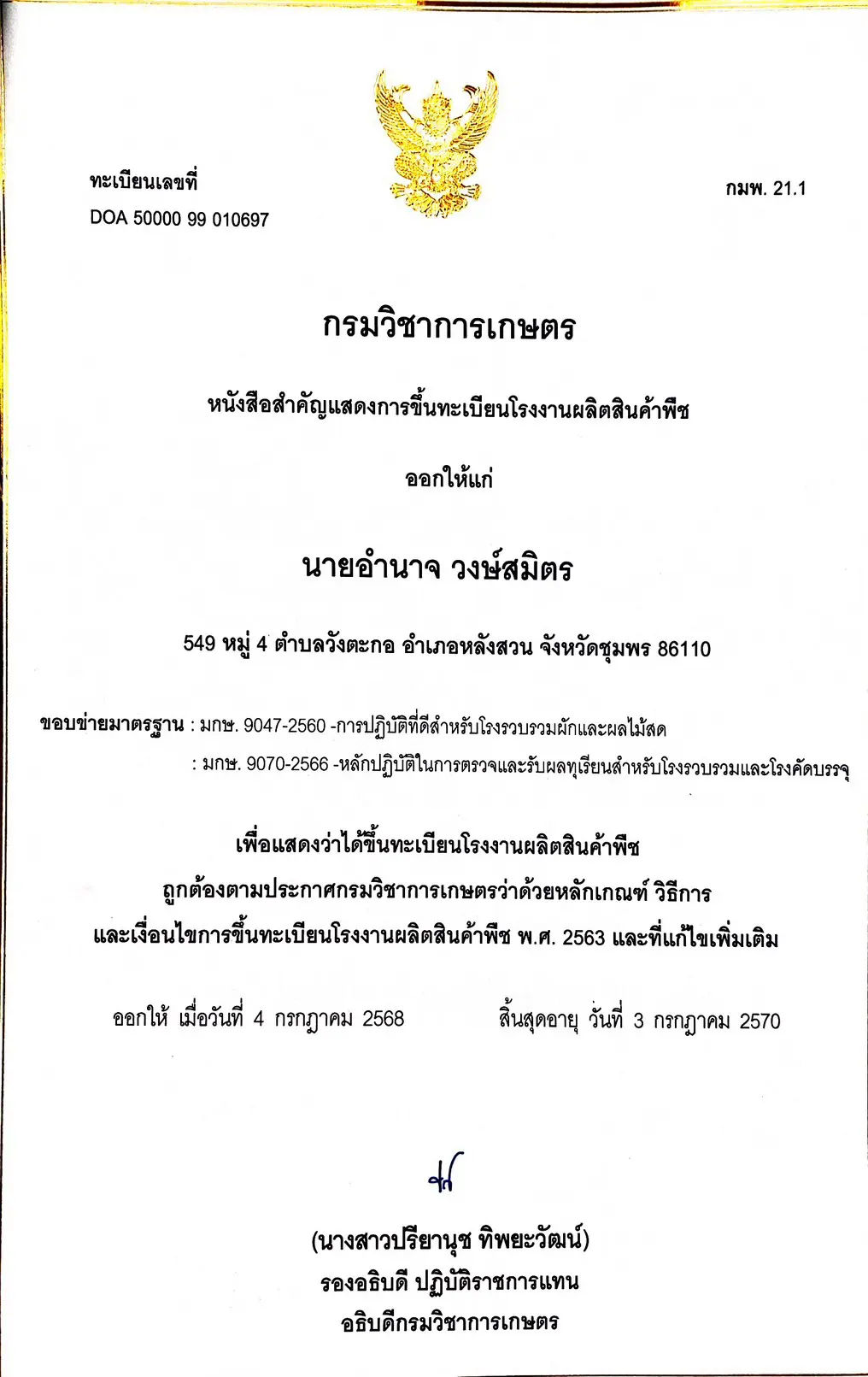 หนังสือสำคัญแสดงการขึ้นทะเบียนโรงงานผลิตสินค้าพืช